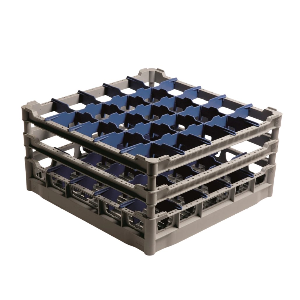 Die jeweiligen Fächer des geteilten Korbs bieten Platz für Gläser mit einem Durchmesser von 90 – 113 mm. Hier finden 16 – 25 Gläser ihren Platz je nach Ausführung. Durch den geneigten Boden wird für ein noch effizienteres Spül – und Trocknungsergebnis gesorgt.